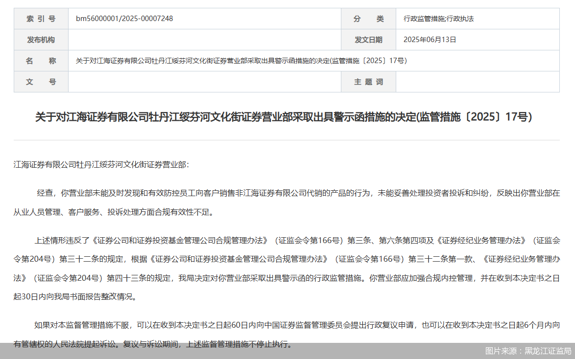 北京商报讯(记者李海媛)6月13日,黑龙江证监局发文称,经查,发现江海证券有限公司牡丹江绥芬河文化街证券营业部(以下简称“牡丹江绥芬河文化街证券营业部”)未能及时发现和有效防控员工向客户销售非江海证券代销的产品的行为,未能妥善处理投资者投诉和纠纷,反映出营业部在从业人员管理、客户服务、投诉处理方面合规有效性不足,违反了相关规定。
